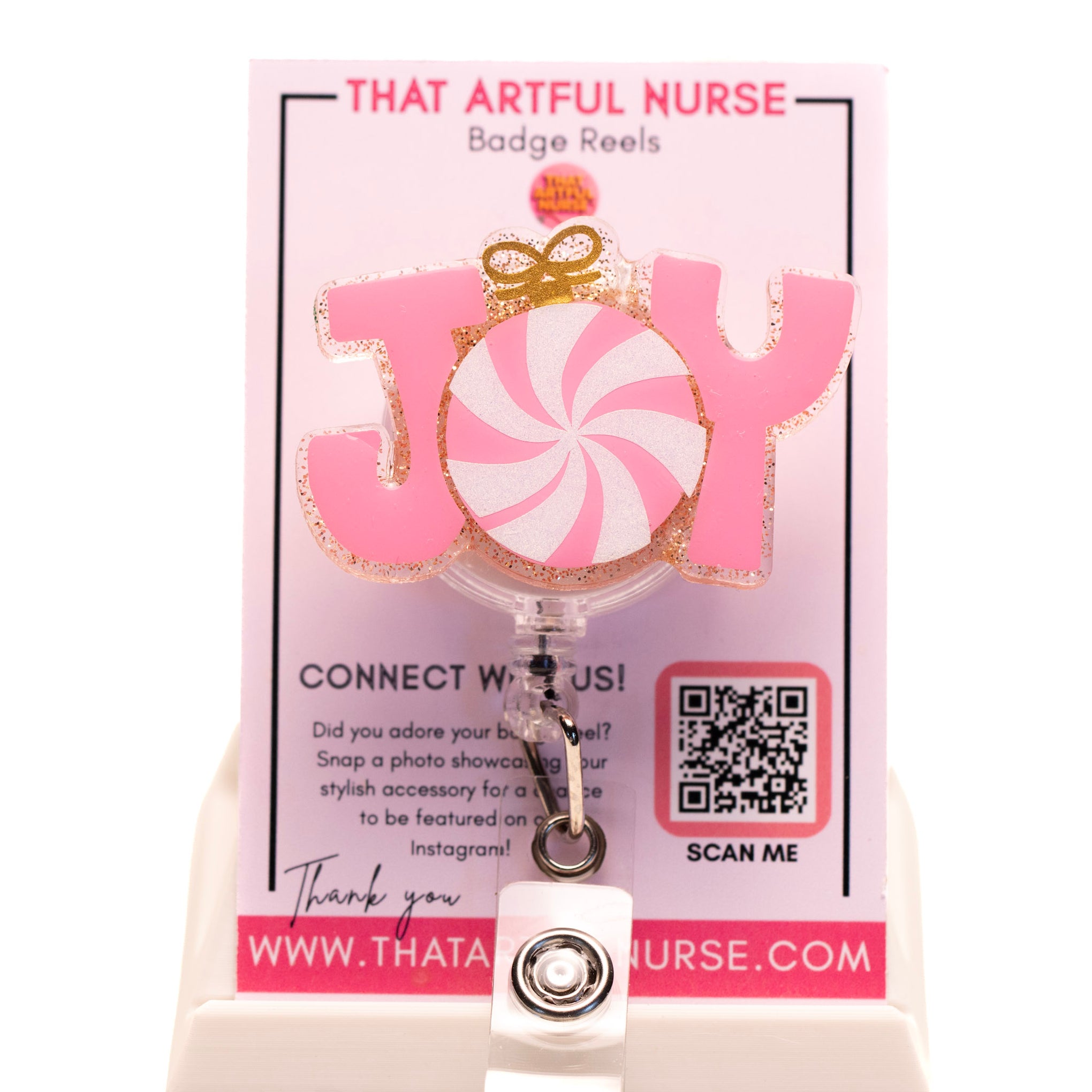 This badge reel features a high-quality acrylic design with the word “JOY” in pink glitter letters, accented by a peppermint candy center and a golden bow. Perfect for adding a pop of holiday fun while keeping your ID or keycard secure and accessible.